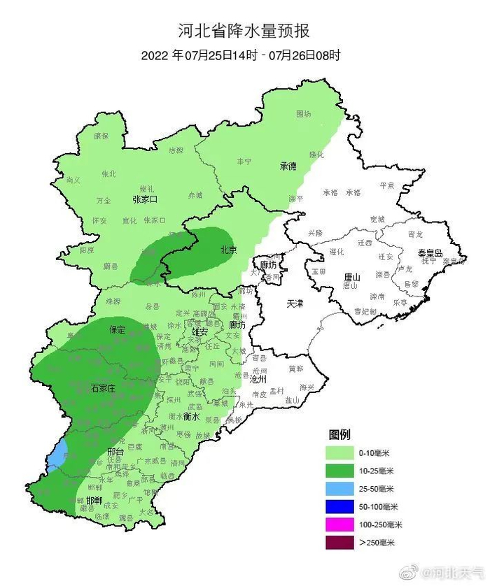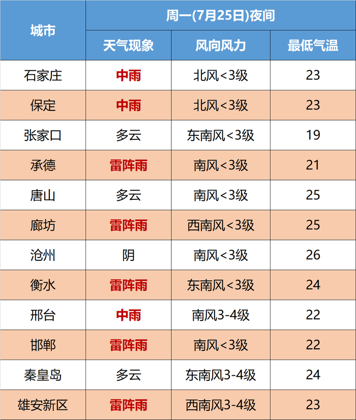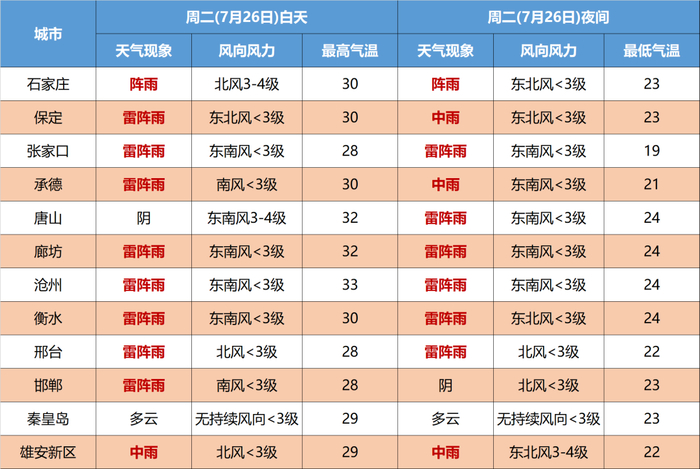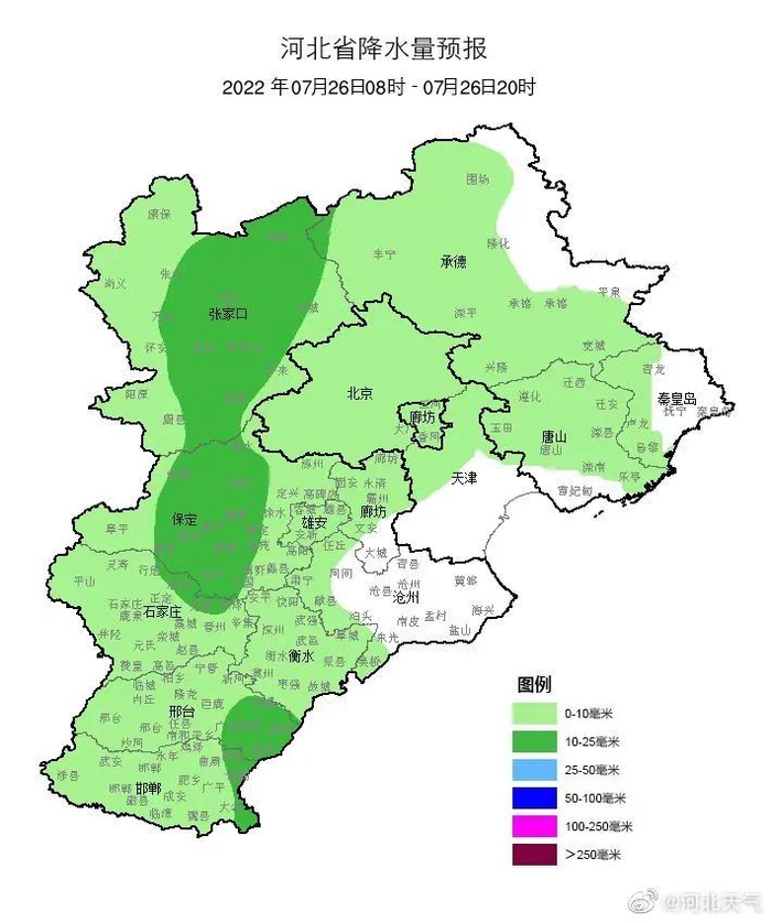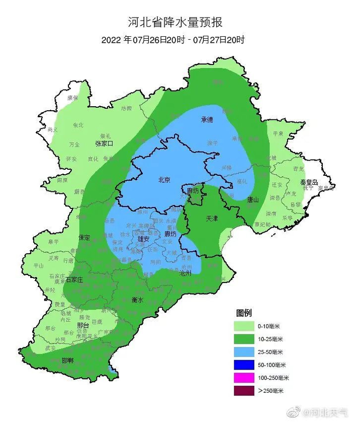 明天夜间到27日,全省阴,张家口东部、承德、唐山北部、秦皇岛北部、保定、雄安新区、廊坊有中到大雨,局地有暴雨,其他地区有雷阵雨或阵雨,雷雨时局地伴有短时大风、短时强降水等强对流天气。