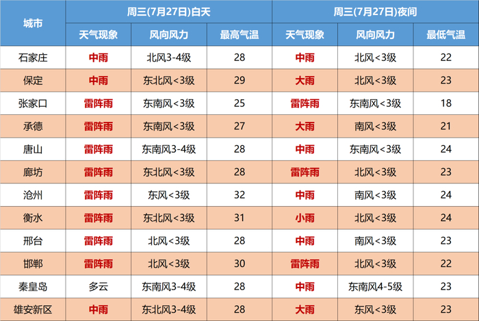 27日夜间到28日,全省阴,唐山、秦皇岛、保定东部、雄安新区、廊坊、沧州有中到大雨,局地有暴雨,个别地点有大暴雨,其他地区有小到中雨,雷雨时局地伴有短时大风、短时强降水等强对流天气。