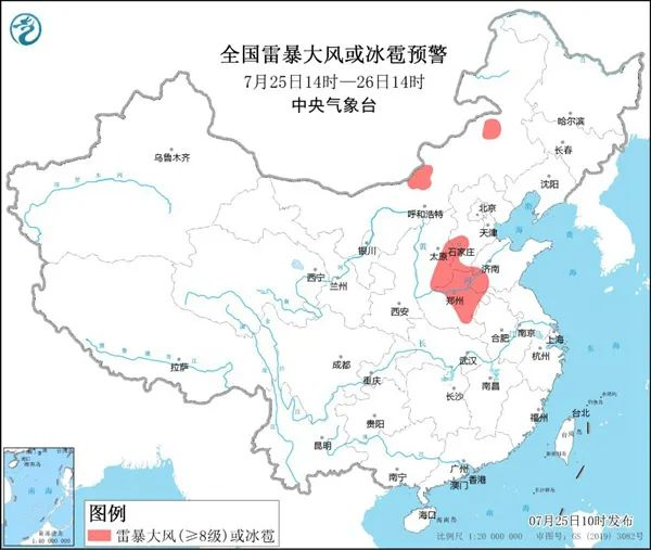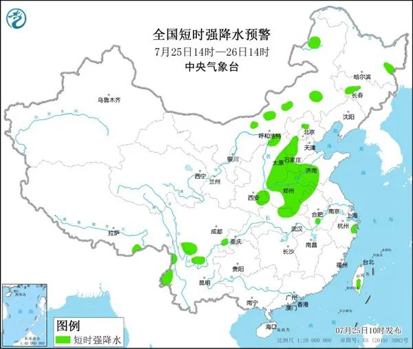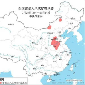 预计7月25日14时至26日14时,内蒙古中北部、山西东南部、河北中南部、山东西南部、河南中北部和东部等地的部分地区将有8-10级雷暴大风或冰雹天气;内蒙古中东部、黑龙江东部、吉林西南部、陕西东南部、山西、河北中西部和南部、北京北部和西南部、山东西南部、河南、安徽北部、江苏北部和西南部、湖北北部、浙江中东部、四川南部、西藏东南部、云南西北部、台湾岛南部等地的部分地区将有短时强降水天气,小时雨量20-50毫米,局地可达70毫米以上。