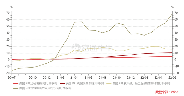 根据中信建投所整理出的美国PPI权重构成图表可以看出,影响供给端的分类并且达到或超过5%的仅包括:运输设备、机械设备、加工食品和饲料、燃料相关产品及能源。根据Wind数据显示,可以看出导致PPI上升最主要的是能源价格的飙涨。