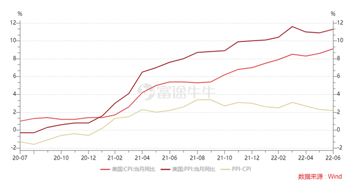 但据Wind数据显示,美国PPI-CPI剪刀差在21年10月开始呈现收窄的走势,但值得关注的是,两者的剪刀差并不是指PPI下行,从下图可以看出,两者仍是螺旋上涨的,但CPI的上升速度快于PPI。