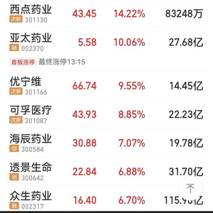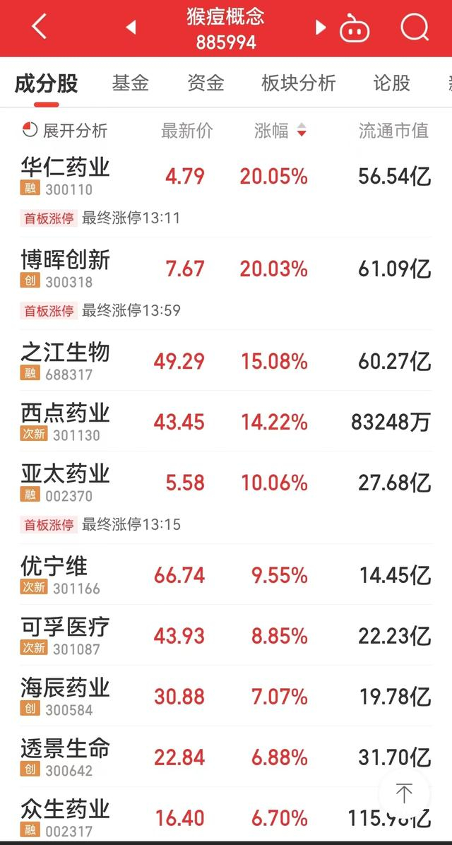 截至7月25日收盘,猴痘概念股爆发,华仁药业(300110)、博晖创新(300318)20%涨停,亚太药业(002370)10%涨停。此外,之江生物(688317)、西点药业(301130)涨14%以上,优宁维(301166)、可孚医疗(301087)、海辰药业(300584)、透景生命(300642)、奥泰生物(688606)等涨6%以上。