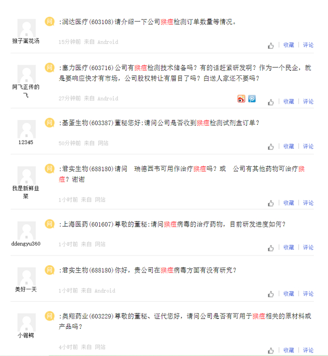 上交所互动平台关于猴痘的提问