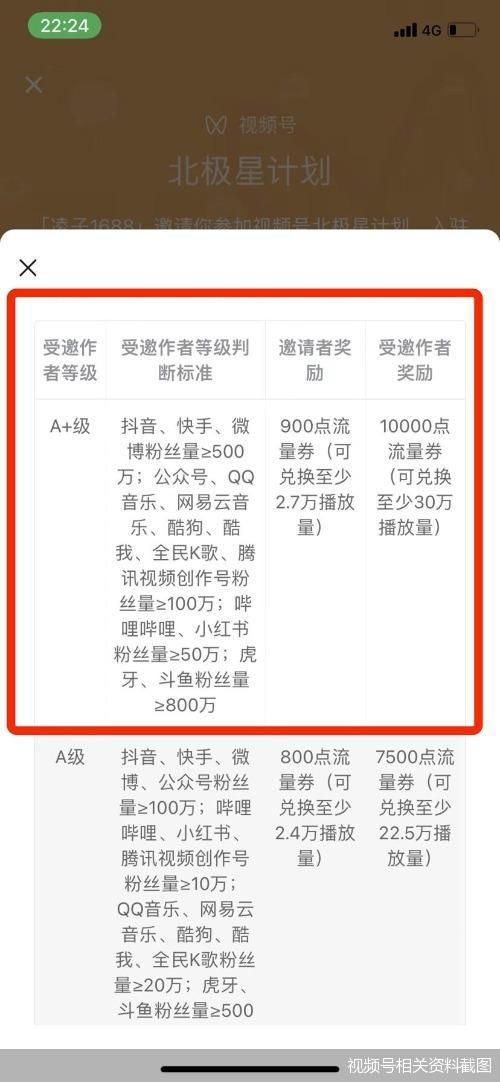 不仅如此,北京商报记者还从一份腾讯定向发布的《北极星计划》中了解到,视频号正大力邀请抖音、快手、微博等平台短视频创作者。较之5月期间的标准,视频号已将最高流量券由7500点提升至10000点,可兑换至少30万的播放量,粉丝量也从100万扩大至500万。