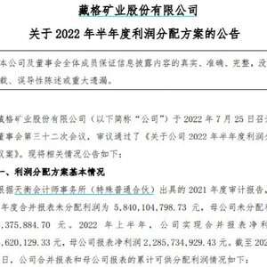 不过,藏格矿业上一次分红还要追溯到2017年中,彼时的实施方案为每10股派3元。此次分红也是该公司自1996年上市以来,最大方的分红方案。