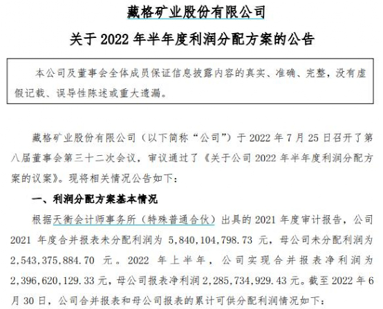 上半年归母净利润23.97亿元,分红总金额30亿元,也就是说,藏格矿业分红比例(分红占净利润比率)达到125.16%。在这一比例面前,贵州茅台2021年51.9%的分红比例也显得逊色不少。而2021年A股公司的分红方案中,分红比例最高的义翘神州为94.4%。截至6月30日,藏格矿业未分配利润为82.37亿元,公司掏出30亿元分红,占到其未分配利润比例高达36.42%,这一比例在A股历史上罕见。