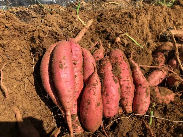 山地种植的蜜薯,因为山地土壤硬,土壤中有石砾,种出来的蜜薯薯形为纺锤形,