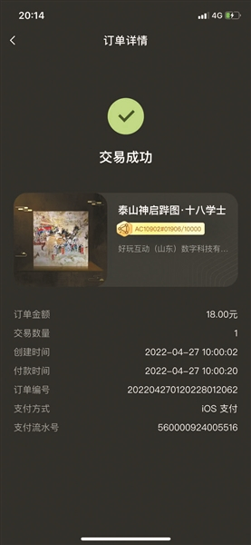 今年4月27日,泰山景区发布限量数字藏品“泰山神启跸图·十八学士”和“泰山神启跸图·东岳大帝”两款产品,其中“泰山神启跸图·十八学士”售价18元,发行1万份,上线仅6分钟就售罄。泰山景区发行三期数字藏品累计销售额超过了200万元。