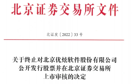 2022年7月18日,优炫软件向北交所提交了《北京优炫软件股份有限公司撤回向不特定合格投资者公开发行股票并在北京证券交易所上市申请文件的申请报告》。根据《北京证券交易所向不特定合格投资者公开发行股票并上市审核规则(试行)》第五十三条的有关规定,北交所决定终止对优炫软件公开发行股票并在北京证券交易所上市的审核。