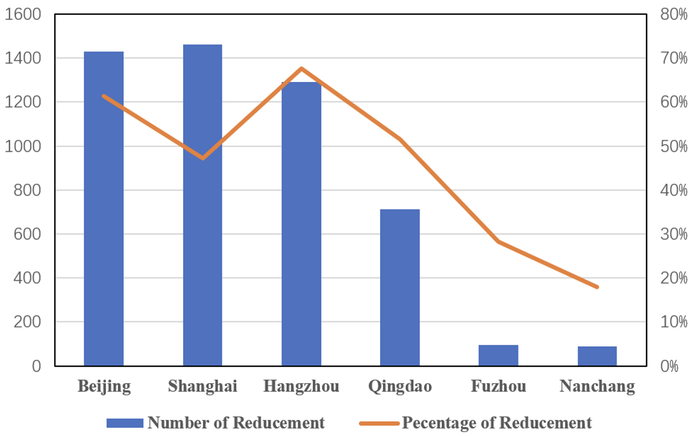 迄今为止,全国共有至少69个城市发布了“双减”实施文件。上图显示了截至去年11月,六个主要城市教培机构减少的情况。其中,北京、上海、杭州,三个教育重地教培机构减少幅度在1200-1500家之间,以上海最多;而杭州的教培减少比例最大,接近70%,意味着10家教培机构中,接近7家因“双减”关门。可见,“双减”在遏制教培扩张方面效果显著。