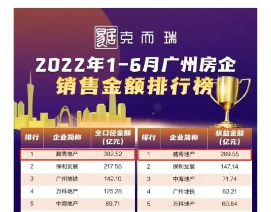 而作为广州城市的共建者和运营商,越秀地产在发展过程中也持续收获来自市场的肯定。2021年,越秀地产凭借深耕广州核心区位的战略布局、品牌力、产品力、TOD创新产品以及雄厚的优质土储等综合优势,在全口径金额、权益金额、流量面积三个方面均取得广州房企第一的佳绩。同时,克而瑞刚发布的《2022年上半年广州房企销售排行榜》中,越秀地产又分别斩获广州房企销售金额榜及销售流量榜等四榜冠军,表现非常亮眼。