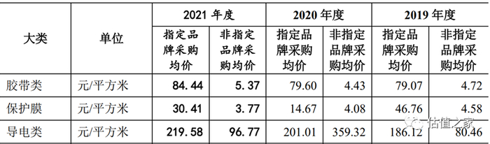 上表可以看出,公司报告期主要原材料胶带类、保护膜和导电类指定品牌采购均价和非指定品牌采购均价的差异,除2020年度导电类指定品牌采购均价低于非指定品牌采购均价外,其他年度各原材料指定品牌采购均价均大幅高于非指定品牌采购均价,有些是十数倍之差,比如2020年的胶带类采购均价,指定品牌是非指定品牌的17.97倍。