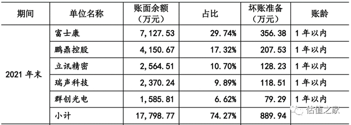 上表是公司2021年末应收账款明细,可以看出第一名为应收富士康,金额为7128万元,第二名为应收鹏鼎控股,金额为4151万元,第五名为应收群创光电,金额为1586万元,应收富士康科技集团关联公司合计金额为12865万元,扣除坏账准备643万元后为12222万元,占公司应收账款余额的比率为53.77%。