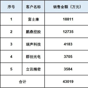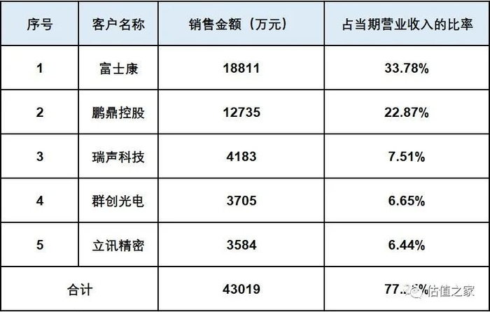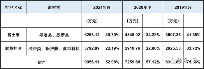 上表是公司2021年前五大客户,排名第一的是富士康,销售金额为1.88亿元,占当期营业收入的比率为33.78%;排名第二的是鹏鼎控股,销售金额为1.27亿元,占当期营业收入的比率为22.87%;排名第四的是群创光电,销售金额为0.37亿元,占比为6.65%。第一、第二和第四名合计销售金额为3.53亿元,合计占销售收入的比率为63.3%。