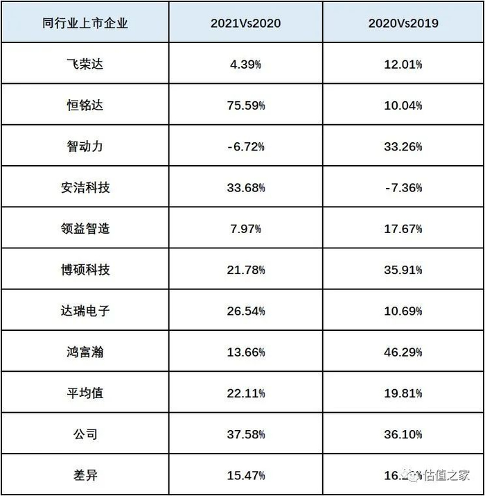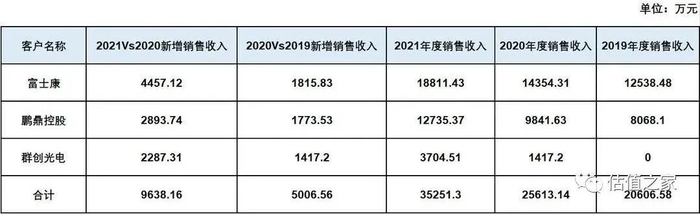 上表是8家同行业上市企业2020年同比2019年及2021年同比2020年增速,平均值分别为19.81%和22.11%,公司分别比同行业上市企业高出16.29个百分点和15.47个百分点,公司这两年稳定的高速发展,确实是碾压同行,表明上看是基于公司对富士康、鹏鼎控股和群创光电销售收入的巨幅增长所致,详看如下分析: