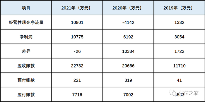 从上表可以看出,公司报告期净利润合计为20021万元,经营性现金净流量为7991万元,二者相差金额为12030万元。2021年经营性现金净流量和净利润的差异很小,主要是来源于2020年,二者差异为10334万元,主要是2020年末应收账款比2019年多出8956万元。2020年末的应付账款相比2019年仅多出1499万元。可见报告期经营性现金净流量和净利润之间的短缺,主要是来自公司2020年应收账款的增加。
