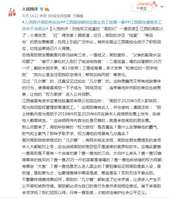 人民网评“国企员工炫耀事件”:对炫权又炫富的“周劼们”一查到底