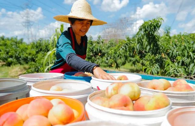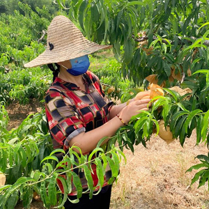 7月25日,记者来到合作社,大片桃林映入眼帘,清甜的桃香扑面而来,一个个比成年人拳头还大的苹果桃压弯了枝头。合作社负责人陆巧英摘下一个鲜嫩透红的苹果桃向记者介绍道:“你看它形状圆润饱满,中心有个酒窝状的凹陷,像不像个长着绒毛的苹果?所以我给它取了‘苹果桃’这个名字。”