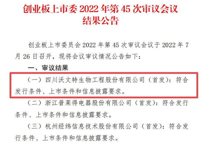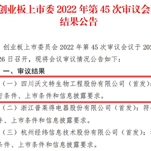 深交所创业板上市委员会2022年第45次审议会议结果显示,四川沃文特生物工程股份有限公司首次发行股份并在创业板上市的申请获通过。
