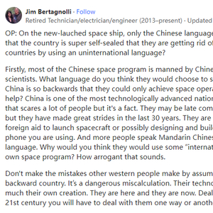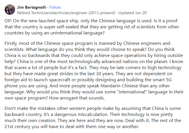 首先,中国的大部分太空计划都由中国工程师和科学家负责。你认为中国人该选择说什么语言?还是你认为中国太落后了,只能靠外援来实现太空计划呢?他们可能是高科技的后来者,但他们在过去30年中取得了长足进步。中国人没有依赖外援来发射航天器,也没有依赖外援来设计和制造你正在使用的5G智能手机。说普通话的人比说其他任何语言的都多。你凭什么认定他们要在自己的太空项目中使用“国际”语言?这听起来多么傲慢。