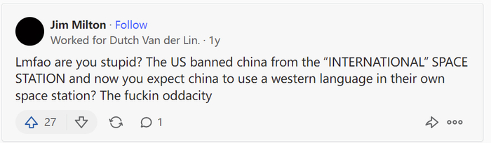一位在荷兰工作的网友指出美国的双标行为:“你傻吗?美国禁止中国进入‘国际’空间站,现在你希望中国在自己的空间站使用西方语言?有毛病吧!”