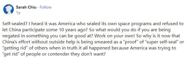还有一位网友对博主所提到的“自我封闭”提出了反驳:“我听说是美国在10年前封闭了自己的太空计划,并拒绝让中国参与?所以,如果你擅长的事情被否定了,你会怎么做?独立工作!那么,为什么现在中国在没有外界帮助的情况下的努力,被抹黑为‘超级自我封闭’或‘摆脱’他人的“证据”?实际上这一切都是因为美国试图‘摆脱’他们不想要的人或竞争者所造成的。”