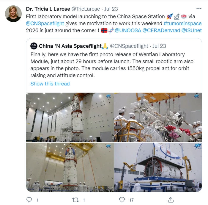 就在近日,挪威奥斯陆大学的研究员特里西娅•拉罗斯(Tricia Larose)博士在推特上发文称,她或将在未来登上中国空间站执行为期31天的任务。