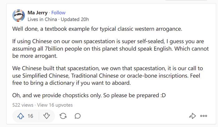 有一位博主在Quora上提问称:在新发射的太空船上只使用中文,这是否说明这个国家超级自我封闭,他们正在通过使用一种非通用语言来摆脱来自其他国家的科学家?