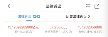 截至目前,公司共涉及1242起法律诉讼,被诉金额合计超过13亿元。