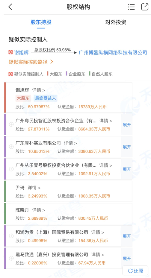 天眼查信息显示,汇桔网主体是广州博鳌纵横网络科技有限公司,创始人谢旭辉任法人并持股约50.98%,其他股东涉及粤民投旗下广州粤民投智汇股权投资合伙企业(有限合伙),持股27.87%;广东厚朴实业有限公司持股10.95%;以及黑马基金旗下黑马致通(嘉兴)投资管理有限公司,持股0.22%等。