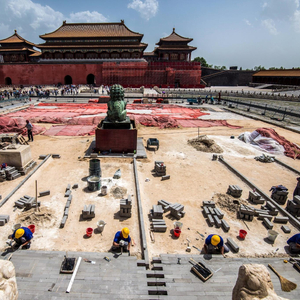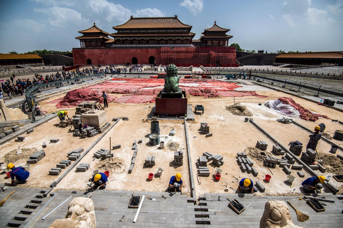 2018年5月22日,故宫博物院,工人们在对地砖进行修补。针对宫内地面地砖因历史悠久、行人踩踏等损毁实际,故宫博物院分块、分时、分段对破损地面进行修补。图/视觉中国