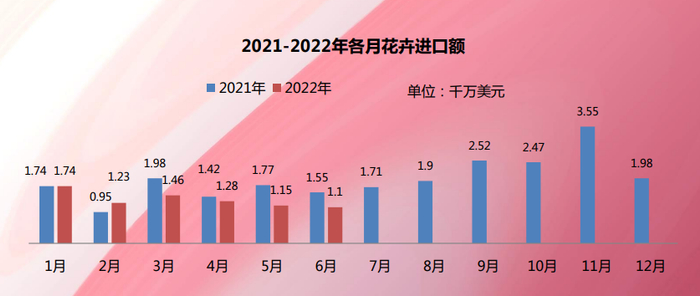 逐月来看,今年1月和2月的花卉进口额同比持平和增加,之后4个月均有较大幅度的减少。