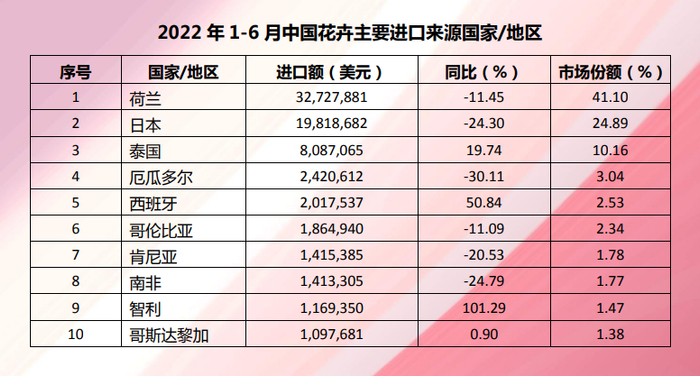 荷兰是今年上半年向中国出口花卉最多的国家,出口额达3272.8万美元,占进口市场份额的41.1%,排在后面的依次是日本、泰国、厄瓜多尔、西班牙、哥伦比亚、肯尼亚、南非、智利等。