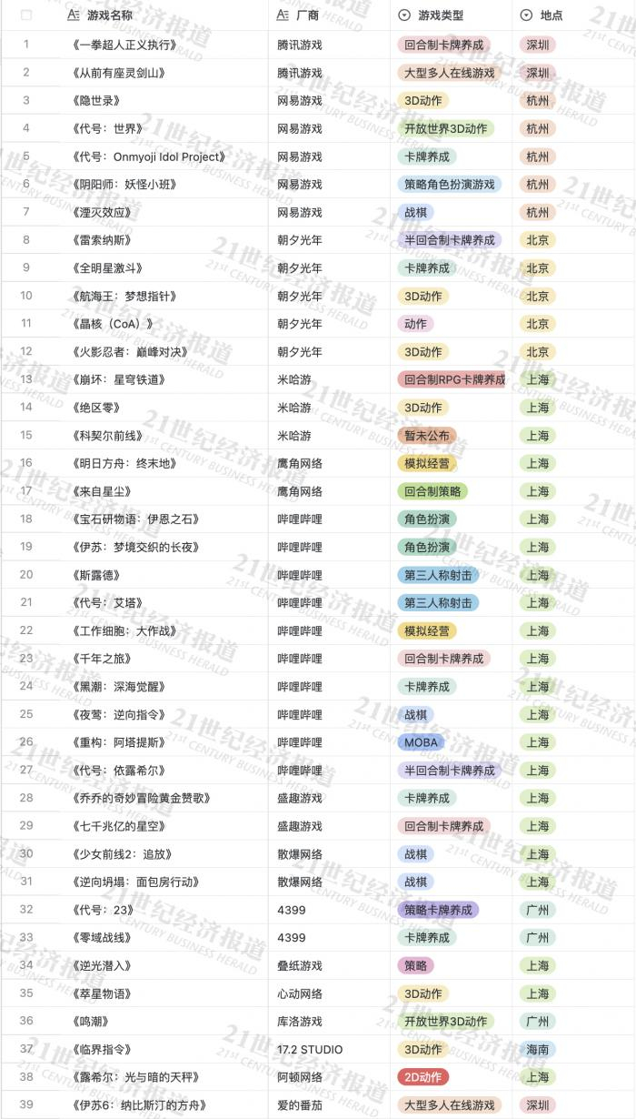 目光聚焦到二次元游戏的具体地区分布,上海是产出最为密集的城市,且遥遥领先。在21记者统计的总计146款还未正式落地的游戏中,共有51款出自上海游戏公司。