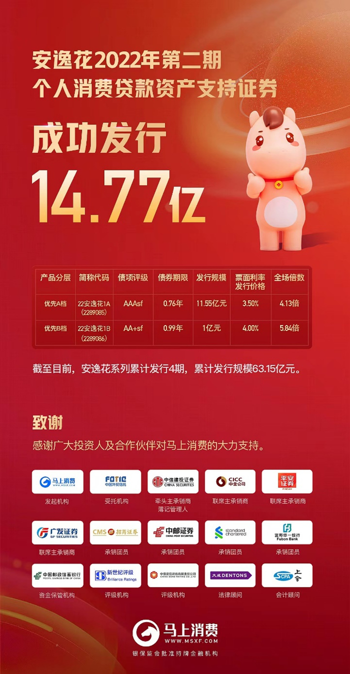 2020年,新冠肺炎疫情突发,持续给很多行业造成了较大冲击,但凭借其强有力的获客、风控、科技、合规及贷后等各项优异的经营能力,深受市场上各金融机构的认可,马上消费的资金市场新动作并未停歇。当年4月14日,该公司在全国银行间债券市场公开发行超17亿元ABS产品——“安逸花2020年第一期个人消费贷款资产支持证券”,受到银行、券商、基金等机构的踊跃认购。