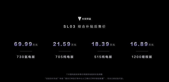 本次上市发布会上,长安深蓝SL03共推出纯电版、增程版、氢电版三种能源形式的车型。在CLTC工况下,纯电版提供515km和705km两个版本,515续航版最高功率可达190kW以上,电耗可低至12.3kWh/100km以下。