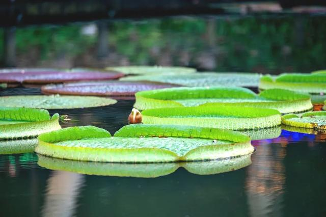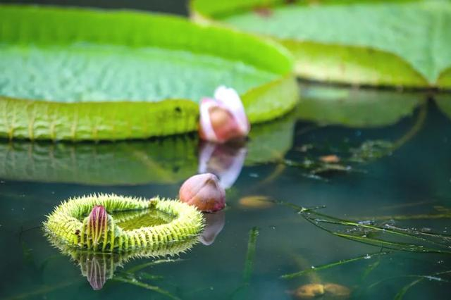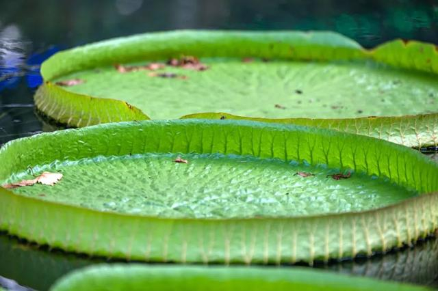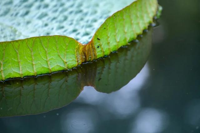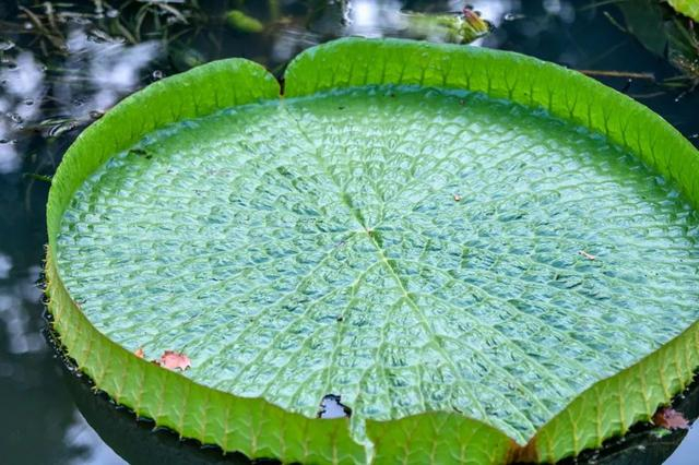 王莲叶片如盘,下雨的时候如何解决叶片排水问题呢?这个水中王者有着自己的小心机:王莲卷曲的叶片边缘长有两个小缺口,它们就像两个巧妙的排水口,可以将雨水轻松排出去。