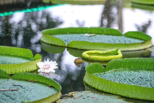 由于园内的王莲进入群体花期,游客可以同时观赏到不同开花时期的王莲花,感受水中王者的“娇容三变”。