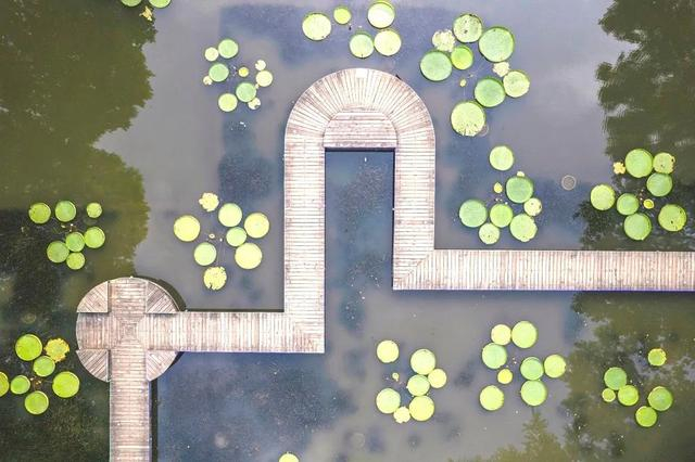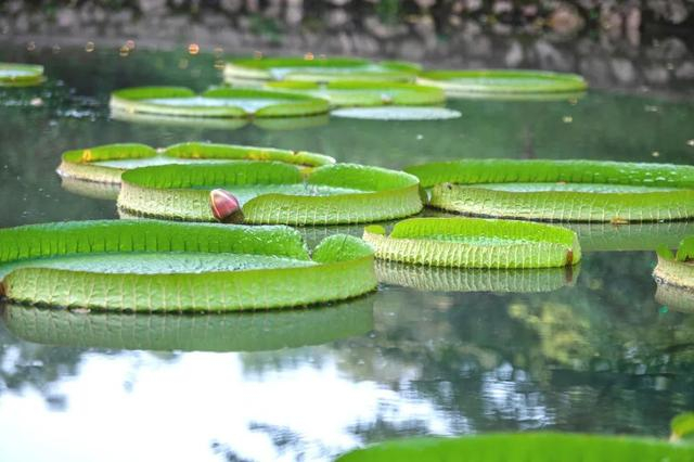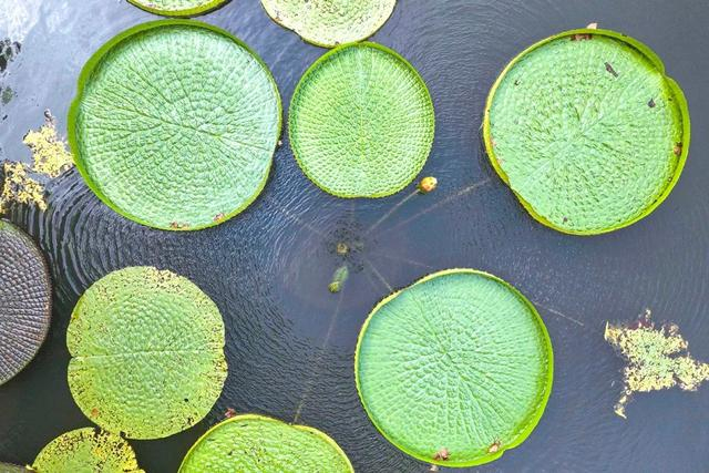 武汉植物园的王莲主要为克鲁兹王莲和长木王莲两种,共有30多株。30多株王莲在水面接连铺开,绿荫如盖,蔚为壮观。从空中俯瞰,一个又一个硕大圆润的叶片似漂浮在水面的圆盘,工整地排列在一起,姿态甚是可爱。