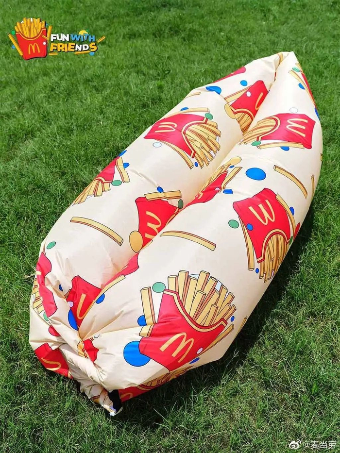 另外两款周边采用了缤纷的配色,大薯飞盘以薯条盒插画设计为主,充满夏日氛围,而大薯充气沙发的整体造型有点像香蕉船,同样以薯条插图的形式铺满。