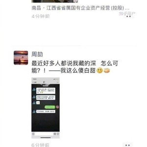近日,一组涉及“炫富”“秀后台”的朋友圈截图在网上引起广泛关注。网传图片显示,微信名为“周劼”的朋友圈发表了一些炫耀财富、家中有后台,互相帮忙走后门等言论,比如“父亲的副局长没问题了”、“省厅人事处的人刚打了电话给我爸”、“感谢家族的所有人(三伯、大伯)”,炫耀一家人都有关系、有背景。7月25日,江西省国有资本运营控股集团有限公司发布通报,称周劼系该公司股权管理部普通员工,对周劼在本人微信朋友圈发表的不当言论,公司第一时间成立了由纪委牵头的调查组进行核查处置。