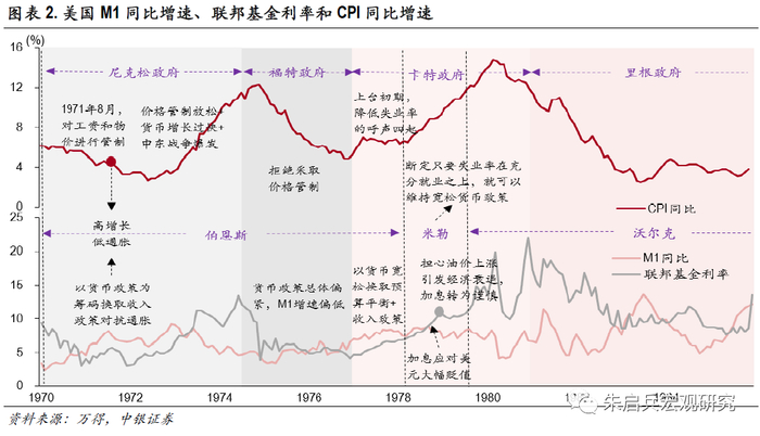 尼克松政府时期,以货币宽松换取价格管制。1970年伯恩斯正式就任美联储主席。在伯恩斯看来,工会是导致失业率居高不下和通货膨胀的罪魁祸首,只要缓解商人对工资上涨的担忧,决策者就可以实现经济增长并控制通胀。因此,尼克松政府时期,伯恩斯以货币政策为筹码,换取收入政策对抗通胀。1971年8月,尼克松宣布一系列措施,包括对工资和物价进行管制。价格管制和扩张性货币政策带来了1972年的高增长和低通胀。但1973年之后,由于价格管制手段逐步放松直至取消,以及货币增长过快,叠加中东战争爆发,CPI同比增速开始迅速飙升,最高升至1974年12月的12.3%。