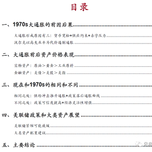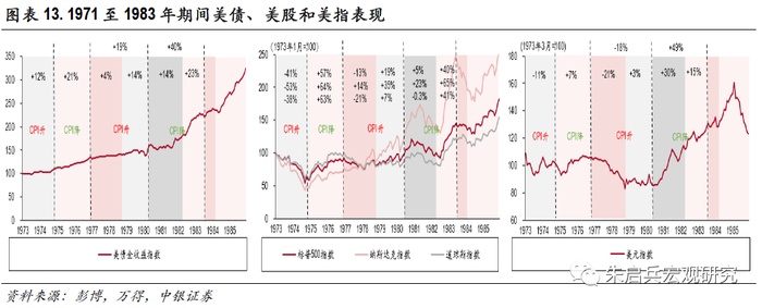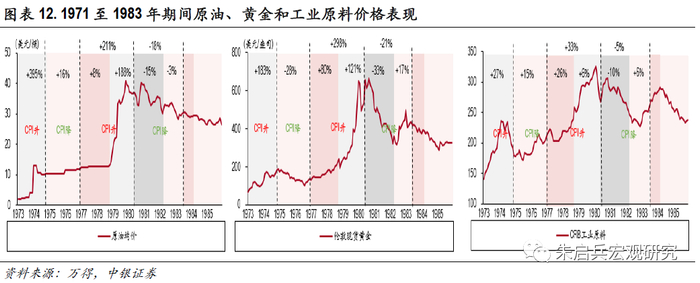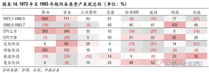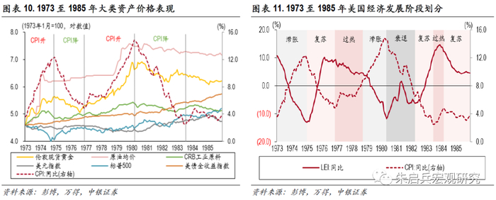 1973年至1983年,美国经历了从大通胀到通胀缓和的过程,期间实物资产表现总体好于金融资产。实物资产中,原油表现好于黄金、工业原料,黄金表现出明显的抗通胀属性;金融资产中,美债表现好于美股、美指,美国三大股指分化明显。