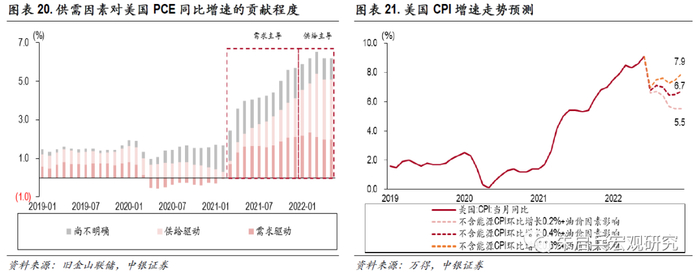 美国高通胀是疫情之后需求端恢复明显快于供给端的结果。2022年以来,受俄乌冲突影响,供给因素对美国通胀的影响加剧(见图表20)。尤其是,能源价格上涨推动整体CPI同比增速持续创新高。根据EIA的最新预测,布伦特油价预计在6月份之后见顶回落。我们根据油价变动情况以及美国CPI中的能源权重大小(2019年至2020年权重为7.348%),可以粗略估算油价变化对CPI环比增速的影响。并且,假设下半年不含能源的CPI环比增速分别为0.2%、0.4%和0.6%,据此测算得出,年内美国CPI同比增速可能自6月份开始见顶回落。如果不含能源CPI环比增长0.6%,美国CPI同比预计在8、9月份小幅反弹,四季度再转为回落,年末仍接近8%。如果不含能源CPI环比增长0.4%、0.2%,预计年内美国CPI同比将持续回落,年末分别降至6.7%、5.5%(见图表23)。
