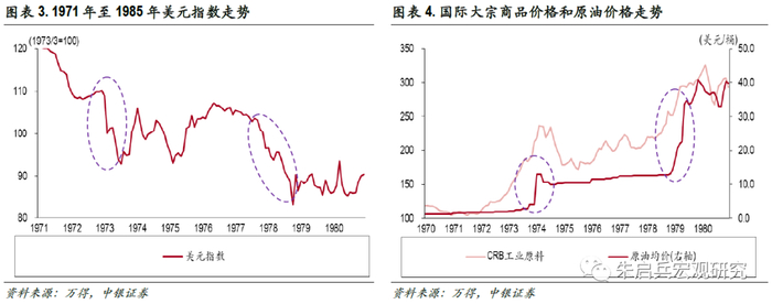 美元由急贬转为急升。1973年至1980年5月,美元指数累计下跌21%,由于包括黄金在内的大宗商品价格均以美元计价,因此商品价格上涨一定程度上受到美元贬值影响。尤其是,1977年10月至1978年10月,美元快速贬值20%,引发国际货币危机。贬值期间,美国政府忽视美元的国际地位,长期听其自然发展。直到1978年10月,美国政府对于美元持续贬值会很快导致国际金融危机也感到恐慌,因此次月宣布与西德、瑞士和日本联合对外汇市场实施大规模干预,美元贬值才被制止。沃尔克就任美联储主席之后,为反通胀采取的高利率政策引起美元持续升值,从1980年5月的96最高升至1985年2月的165。
