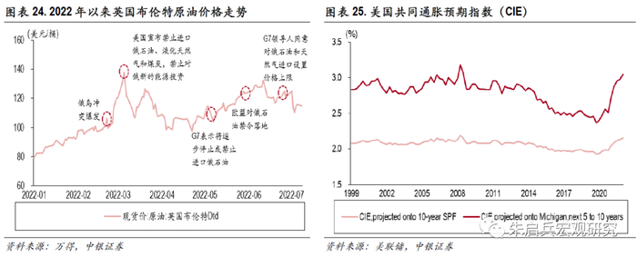 2022年以来,在俄乌冲突触发避险交易之后,全球市场在通胀交易和衰退交易之间不断切换:3月至5月中旬美联储先后宣布加息25bp和50bp以及缩表计划,紧缩预期增强下,美债收益率持续上升,美指升至104上方,美股和商品价格震荡下跌;5月中旬至6月上旬,由于市场对美联储紧缩充分定价,各类资产价格有所修复;6月10日发布的5月美国CPI数据超出市场预期,导致紧缩预期再次增强;6月15日至24日、7月1日至7日,市场对美国经济衰退担忧加剧,美债收益率回落,美股反弹,商品价格下跌,美元指数受欧元贬值推动,升至107上方;7月8日美国非农就业数据超出市场预期,美联储紧缩预期再次升温,美债收益率上升,标普500指数转为下跌,原油价格有所反弹(见图表26)。下半年,我们预计通胀交易与衰退交易的博弈延续。