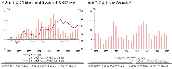 1965年约翰逊成功连任总统后,宣布实施伟大社会计划。1967年开始,国内社会保障计划带动联邦财政支出大幅攀升,占GDP比重最高升至1984年23%,但财政收入没有太大的趋势性变化。由于大幅增长的转移支付主要用在了收入再分配上,导致不同利益群体很难就可接受的税收水平达成共识,公开征税很可能激化各阶层的矛盾。因此,政府只好诉诸于通胀,作为临时增收手段。这带来的结果是,通胀指标和财政赤字占GDP比重同时从1960年代中后期开始走高(见图表6)。