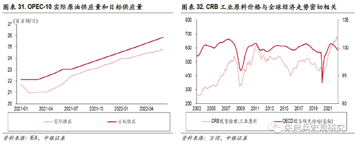 预计实物资产表现:黄金>原油>工业原料。1)黄金是以美元计价的无息资产,美元指数和实际利率均会影响金价。短期美元和美债利率仍有上行空间,预计黄金价格仍将承压。在美联储紧缩放缓之后,随着美元和美债利率回落,金价可能重获上行动力(见图表29、30)。2)国际原油以美元计价,美元升值也会在一定程度上影响油价表现(见图表29)。目前俄乌冲突带来的原油供应风险减弱,全球经济衰退预期导致原油价格承压。不过,欧盟对俄罗斯制裁风险仍然存在,并且OPEC主动增产意愿较弱(见图表31),预计将对中长期油价形成支撑。3)工业原料价格与全球经济走势密切相关,经济下行趋势将对工业原料价格形成压制(见图表32)。