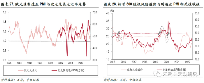 预计金融资产表现:美元>美债>美股。美联储主席鲍威尔在6月FOMC会后新闻发布会上表示,如果没有有力的证据表明通胀下降,美联储不会宣布胜利。6月美国CPI增速继续超预期,意味着短期美联储不会放缓紧缩节奏。1)美元指数短期仍有上行空间,在美联储紧缩放缓之后可能触顶回落。当然,如果美国通胀韧性超出预期,美联储不得不加大紧缩力度,美元指数更是易上难下。此外,即便欧元已经跌破平价,但欧洲经济下行压力、能源供应风险以及欧元区内部融资成本分化等问题,均可能继续施压欧元,进而支撑美元(见图表27)。2)美债收益率短期可能上行,在美联储放缓紧缩节奏之后转为下降,总体呈现震荡走势。3)在美债收益率短期上升过程中,美股尤其是成长股承压。如果年底美国制造业PMI降至50以下,股权风险溢价可能升至2.5%上方(见图表28)。假设年底美债收益率和股权风险溢价均为3%,对应的标普500市盈率为16.7倍,低于目前的19倍。2021年底预期未来12个月每股收益是216,据此计算标普500的合理水平是3600点,这意味着未来仍存在近10%的下跌空间。