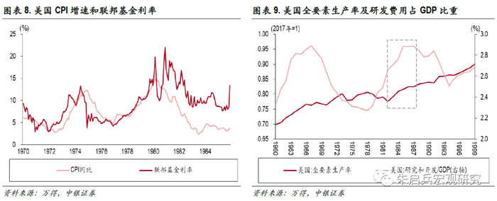 供给学派的学说是里根执政的重要理论基础,认为美国经济困境来自储蓄率下降、技术革新速度放缓等原因导致商品竞争力下降,强调从供给方面寻求经济对策,主张减税、削减政府支出、减少政府干预。里根上台后积极向国会提出减税计划,并放松了多个行业的干预和管制。例如,1981年签署“解除石油价格和分配管制法案”,使美国国内油价首次与国际接轨,刺激了石油公司增加在美国国内的油气勘探和生产投资。但1981年至1982年这些政策并没有发挥应有的作用,失业率反而继续上升,导致里根在1982年11月中期选举前的支持率明显下降。出于对新兴市场债务违约威胁国际金融体系稳定的担忧,美联储自1982年下半年开始降息。受此影响,美国经济自1982年四季度开始复苏。中期选举之后,里根积极推动产业结构转型,改造并资助传统工业部门,增加支持电子、光导纤维和新能源开发等新兴工业部门的科研投资,为经济增长提供新动力。1983年至1988年,美国研发费用占GDP比重上升0.2个百分点,全要素生产率增长7.3%(见图表9)。